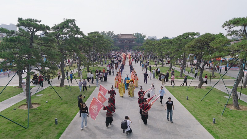 本次文化旅游節(jié)活動自10月1日持續(xù)至10月5日,活動期間設(shè)置了主題鮮明、層次豐富的特色內(nèi)容。每日10時(shí),來自中華泰山·封禪大典的演藝團(tuán)隊(duì)以《萬國來朝·盛世啟市》主題演出拉開序幕。天鼓初鳴之際,悠遠(yuǎn)號角與鏗鏘鼓點(diǎn)交織共鳴,依次呈現(xiàn)開場迎賓禮、司禮官肅穆登場、舞姬書生伴唐宮人物(李治、武則天)盛裝巡游。巡游結(jié)束后,演員們將化身隱藏NPC,身著唐宮華服扮演“帝王”“貴妃”等角色,與游客展開對詩猜謎、合影互動等環(huán)節(jié)